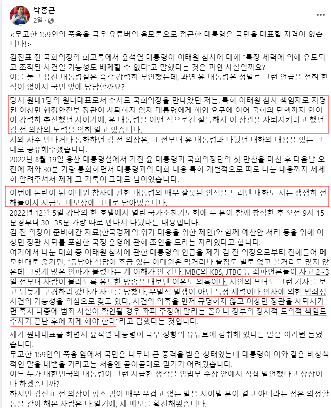 정리하자면 이태원 참사 당시 박홍근 원내대표가 김진표 전 국회의장과 수시로 소통을 했고, 김진표 국회의장은 대통령과 대화 내용을 그대로 공유했다고 한다. 이태원 참사의 책임을 물어 이상민 행정안전부 장관을 사퇴시켜야 한다는 의견에 대해 윤석열 대통령은 '술집도 별로 없고 볼거리도 많지 않은데 인파가 몰렸다는 게 이해가 안 간다며 MBC, KBS, JTBC 등 좌파언론들이 사고 2~3일 전부터 사람들이 몰리도록 유도한 방송을 내보낸 이유가 의혹이다"라고 말했다.